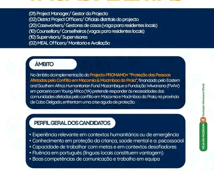 O Projeto PROMAMO+ é uma iniciativa humanitária implementada em Cabo Delgado, no entanto foca no apoio às comunidades afetadas pelo conflito, especialmente nos distritos de Macomia e Mocímboa da Praia. Dessa forma, o programa procura melhorar a proteção, o bem-estar e a resiliência das populações vulneráveis, através de atividades comunitárias, apoio psicossocial e assistência social. Além disso, para alcançar esses objetivos, estão abertas várias vagas destinadas a profissionais comprometidos em contribuir para o desenvolvimento e recuperação das comunidades locais.